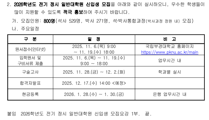 국립부경대학교 일반대학원에서는 2026학년도 전기 정시 신입생을 모집하오니 우수한 인재들의 많은 지원바랍니다.